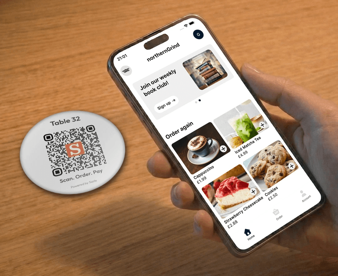 Sizzle’s QR codes do the heavy lifting—taking customers straight to your branded app where they can browse the menu and pay in seconds.